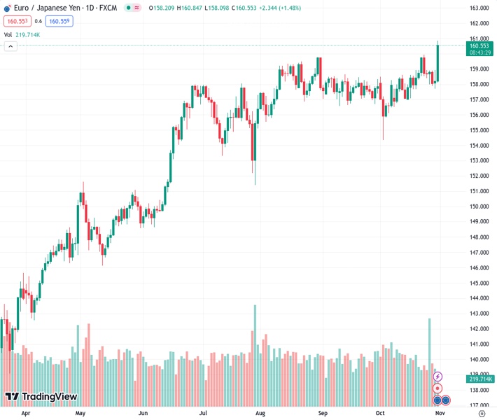 EURJPY currently trading at 160.62 at the time of writing. Pair opened at 158.14 and is trading with a change of 1.57 % .