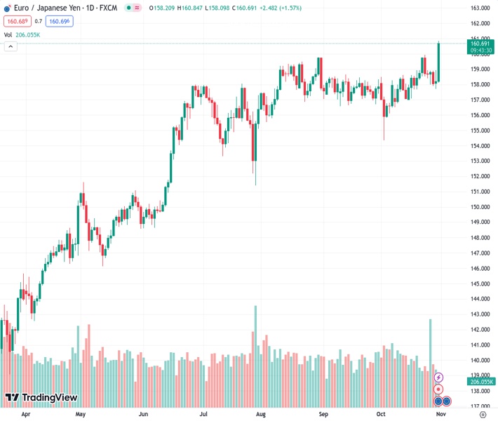 EURJPY currently trading at 160.69 at the time of writing. Pair opened at 158.14 and is trading with a change of 1.61 % .