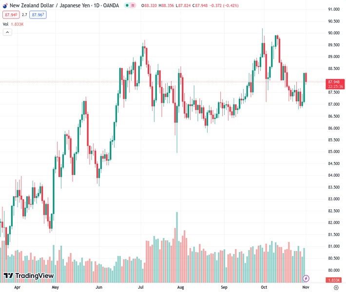 NZDJPY currently trading at 87.94 at the time of writing. Pair opened at 87.11 and is trading with a change of 0.95 % .