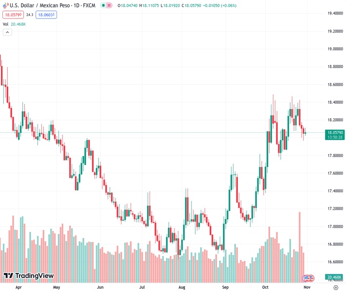 USDMXN currently trading at 18.0766 at the time of writing. Pair opened at 18.0492 and is trading with a change of 0.15 % .