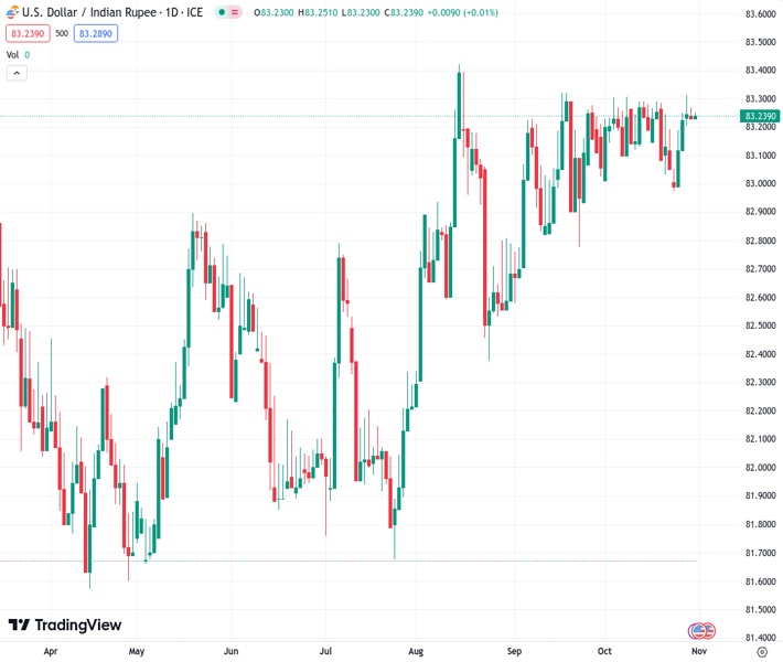 The Indian Rupee trades with mild losses on the day. The USD/INR pair trades within a familiar range of 83.00–83.35. However, the technical outlook suggests that the bullish bias stays intact as the pair holds above the 100- and 200-day Exponential Moving Averages (EMA) on the daily chart.