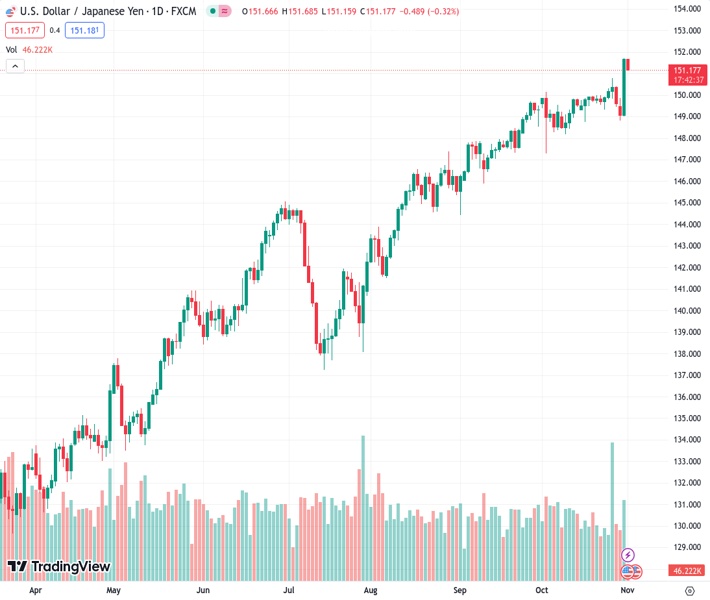USDJPY currently trading at 151.22 at the time of writing. Pair opened at 151.67 and is trading with a change of -0.3 % .