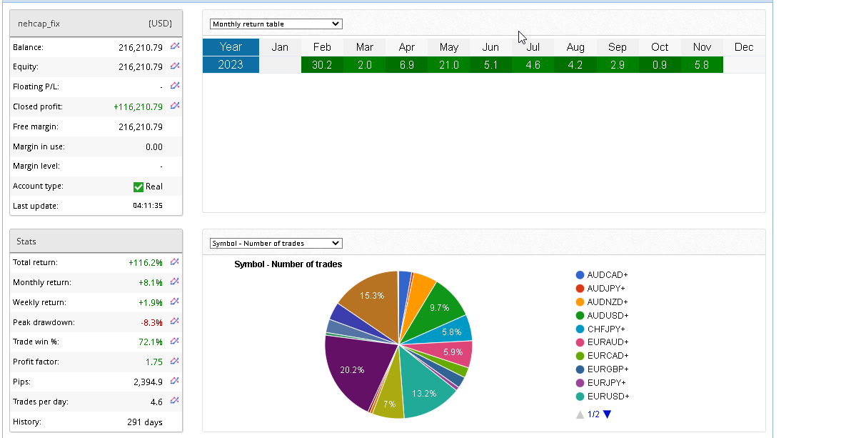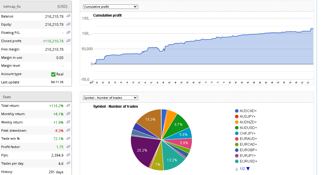 The EA_FIX system is up +116% returns, Our live account has now risen above $216,000. We started at 100,000. That is a true testament to the reliability of the system. The max dd has been very low. Each trade well protected by breakeven stops and total stop losses. There is no system that comes close to this powerful scalper working on FIX channel.