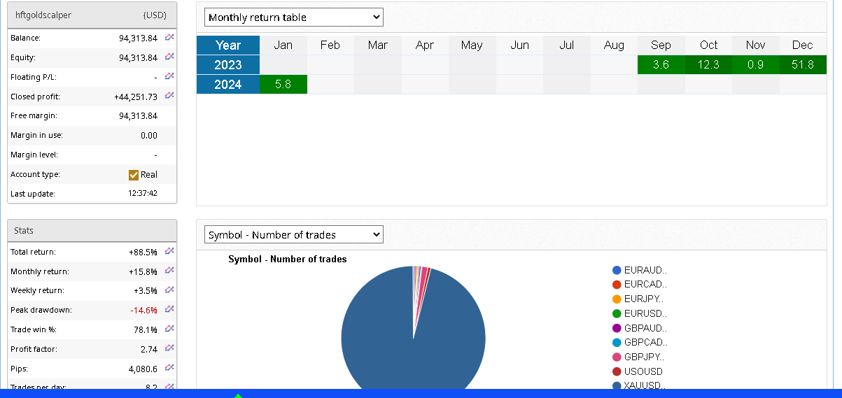 The GOLD HFT for January clocks +5.8% return. DD max was 15% back in Nove 2023. The system only trades GOLD on this account. Extremely profitable. Backtested since 2010 on tick data. The live account performance is shown below.