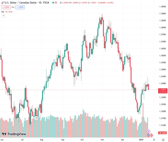 USD/CAD retraces its recent gains recorded on Thursday, trading lower near 1.3350 during the European session on Friday. The Canadian Dollar (CAD) is strengthening, influenced by the positive movement in Crude oil prices. This uptick in oil prices is attributed to escalating tensions in the Middle East following military attacks by the US and UK on Iran-backed Houthi locations in Yemen.