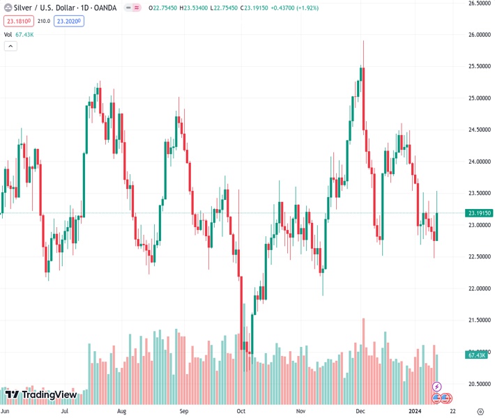 • Technical analysis shows Silver trading in a sideways trend; immediate support at $23.00, followed by $22.48.