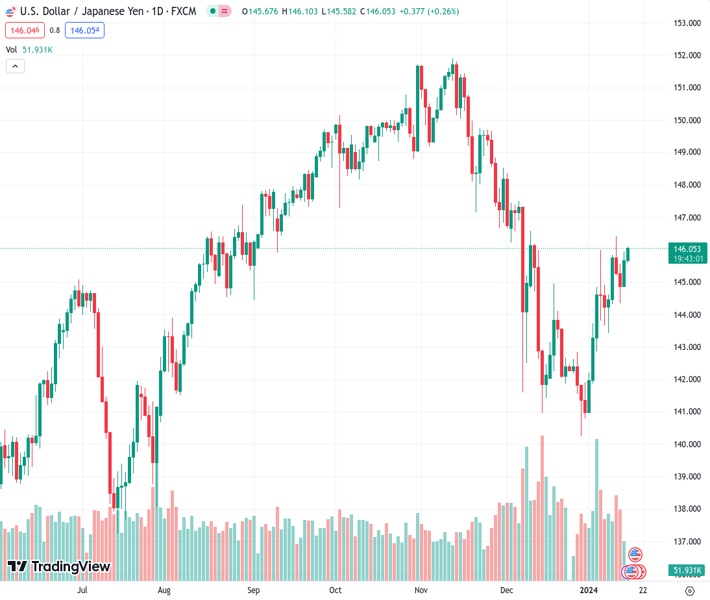 The USD/JPY pair holds positive ground below the 146.00 barrier during the early Asian session on Tuesday. The uptick of the pair is bolstered by the stronger US Dollar (USD) broadly. Investors await the US NY Empire State Manufacturing Index on Tuesday for fresh impetus, which is expected to show a decrease of 5 in January from a 14.5 fall in the previous reading. At press time, USD/JPY is trading at 145.90, gaining 0.08% on the day.