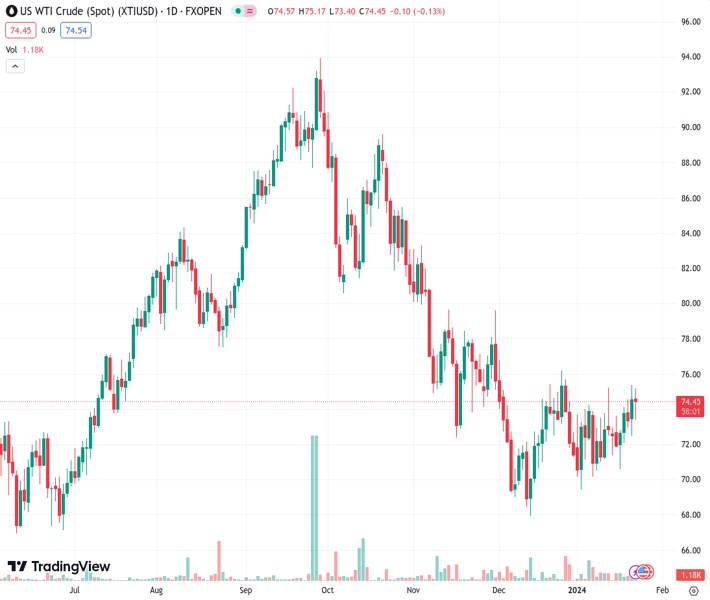 XTIUSD currently trading at 74.48 at the time of writing. Pair opened at 74.57 and is trading with a change of -0.12 % .