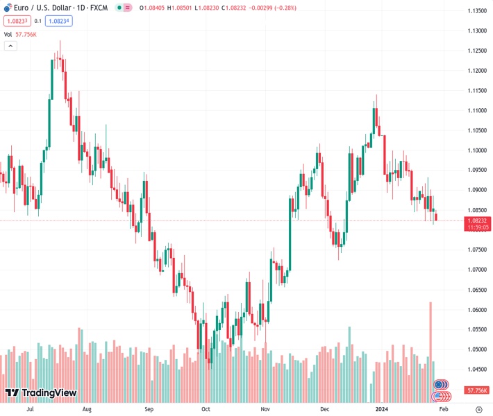 At the time of writing, EUR/USD is trading 0.25% lower on the day at 1.0825.
