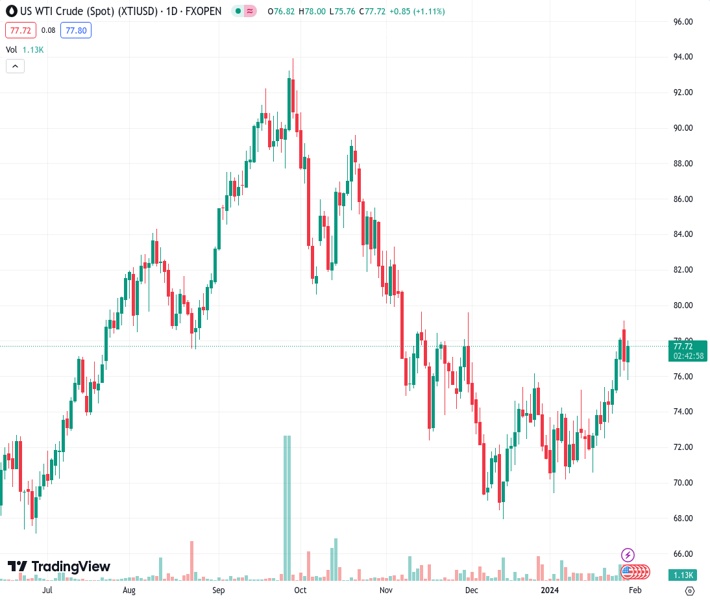 West Texas Intermediate (WTI), the US Crude Oil benchmark, rises amid escalating tensions in the Middle East, along with updated forecasts of the International Monetary Fund (IMF), suggesting the global economy would grow more than expected. At the time of writing, WTI exchanges hands at $77.89, up 1.25%.