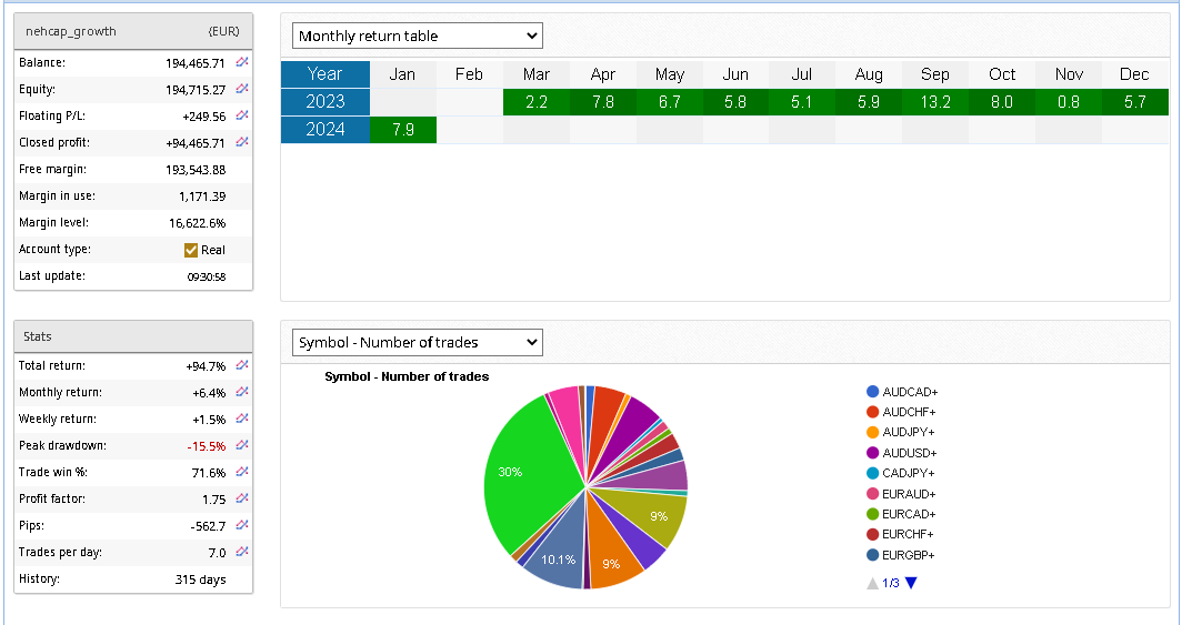 to add returns. January 2024 has given us +7.9% return adding to our account. This is a MT4 system and highly reliable as seen by the performance on our LIVE. The system operates on LIVE account so its very safe. Our 100k account now sits nicely at $194.5k.