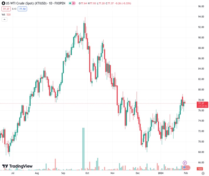 Crude oil prices may experience a positive impact following the recent update on global economic growth by the International Monetary Fund (IMF). The IMF has revised its forecast, indicating expectations of stronger growth, particularly in the economies of the United States and China. Furthermore, the Chinese monthly Non-Manufacturing Purchasing Managers’ Index (PMI) indicated an improvement in the performance of China’s service sector for January arrived at 50.7, slightly surpassing the expected figure of 50.6. While, the Manufacturing PMI reached 49.2, meeting the anticipated value and advancing from the previous reading of 49.