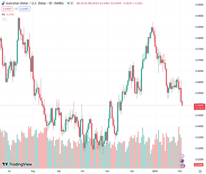 At the press time, the AUD/USD pair is down 0.27% on the day to trade at 0.6498.
