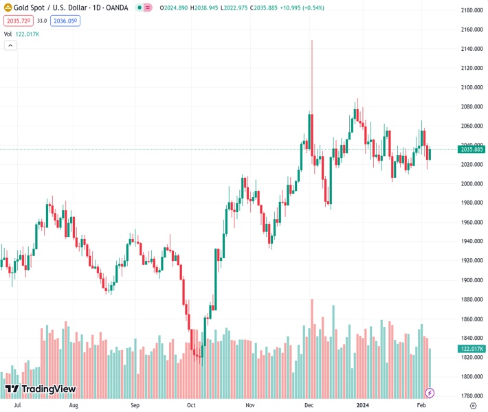 • The XAU/USD currently stands at $2,035 up by 0.52%.