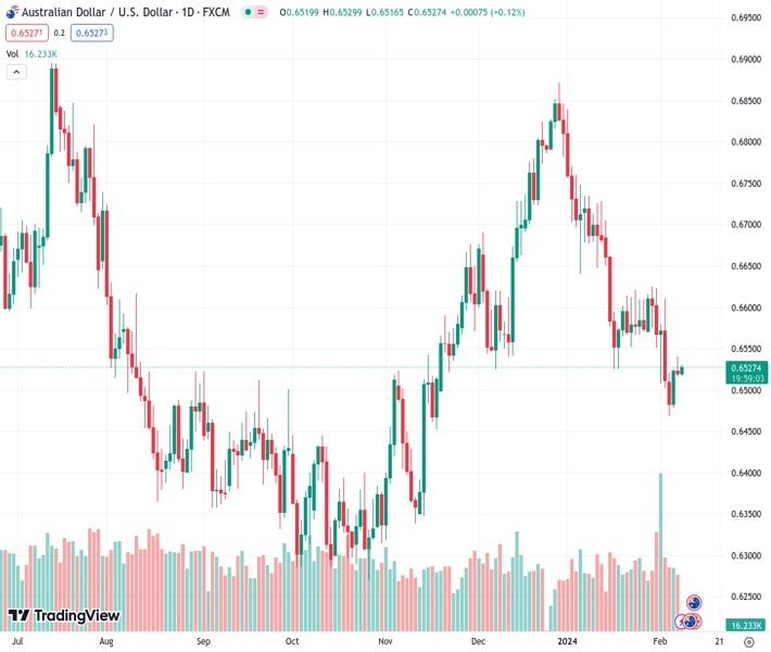 The Australian Dollar trades around 0.6530 on Thursday, slightly below the immediate resistance level at 0.6550. A breakthrough above this level could potentially catalyze further upward movement for the AUD/USD pair, with potential targets including the 23.6% Fibonacci retracement level at 0.6563 and the 21-day Exponential Moving Average (EMA) at 0.6579. On the downside, key support is anticipated at the psychological level of 0.6500. Additional support levels include the weekly low at 0.6468, followed by a major support level at 0.6450.