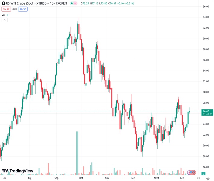 WTI crude rises 0.25% above $76.50 amid Israel-Hamas conflict escalation and US production changes. (Pivot Orderbook analysis)