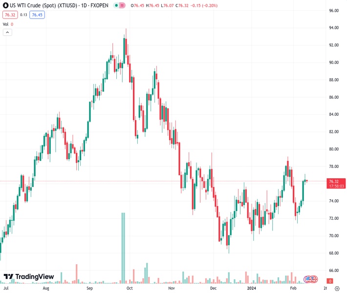 XTIUSD currently trading at 76.32 at the time of writing. Pair opened at 76.51 and is trading with a change of -0.25 % .