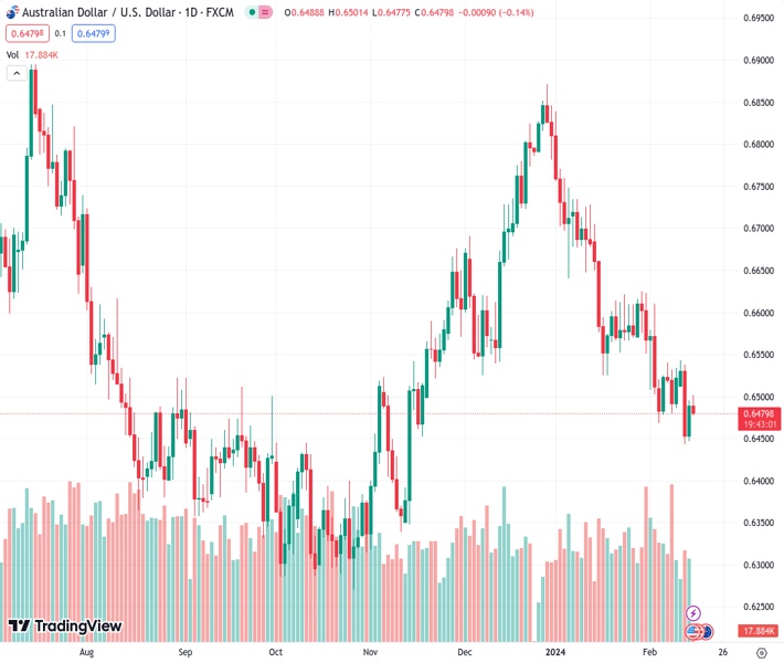 The Australian Dollar trades near 0.6490 on Thursday following the next major support at 0.6450 before the weekly low at 0.6442. A break below this level could push the AUD/USD pair to navigate the region around the psychological support of the 0.6400 level. On the upside, the AUD/USD pair faces a significant resistance level at the psychological threshold of 0.6500. If this level is breached, it could potentially propel the AUD/USD pair toward the 14-day Exponential Moving Average (EMA) located at 0.6522. Further upward movement may target the 23.6% Fibonacci retracement level at 0.6543, followed by the major resistance level at 0.6550.