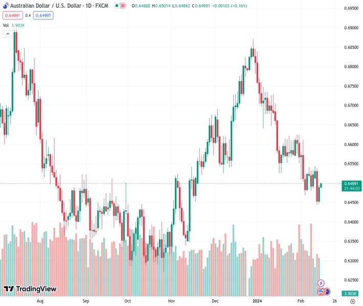 At the press time, the AUD/USD pair was up 0.12% on the day to trade at 0.6499.