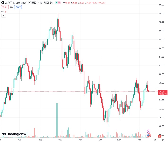 XTIUSD currently trading at 76.0 at the time of writing. Pair opened at 76.33 and is trading with a change of -0.43 % .