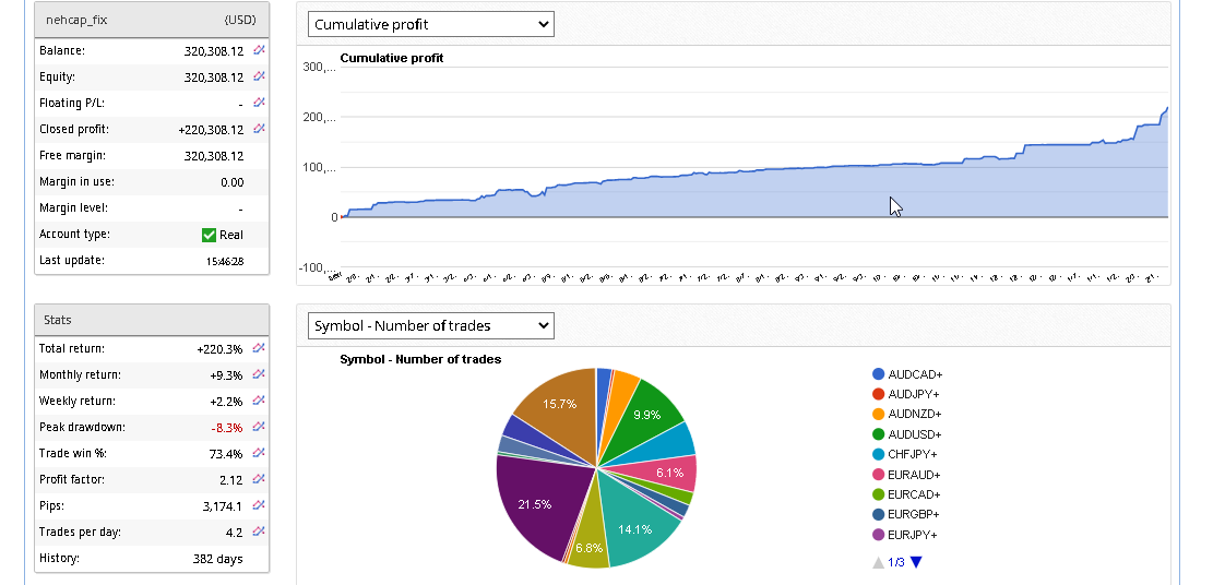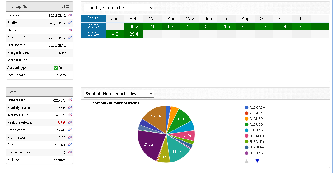 These are verified from third party myfxbook and fxblue. The HFT_FIX February month adds returns of +25%. The total returns climbs +220%. The max DD is a mere 8%.