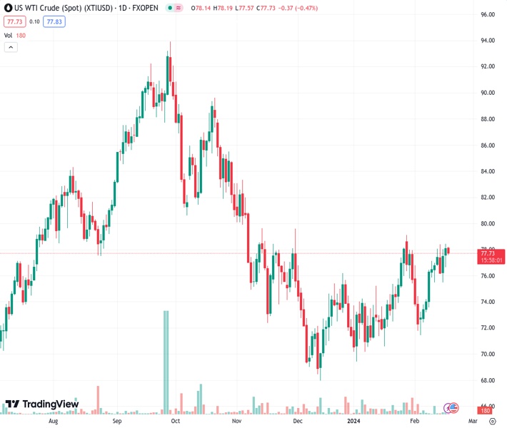 The West Texas Intermediate (WTI) oil price retraces its recent gains, possibly due to a technical correction, amid subdued trading activity due to the Presidents’ Day holiday in the United States. WTI price dips lower to around $77.80 per barrel during Asian trading hours on Monday. Additionally, market participants are expected to closely monitor demand conditions in China after returning from the week-long holiday.