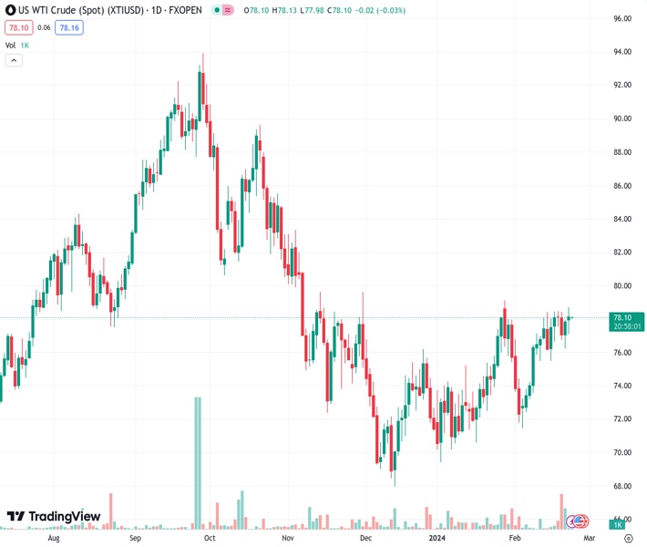 XTIUSD currently trading at 78.03 at the time of writing. Pair opened at 78.27 and is trading with a change of -0.31 % .