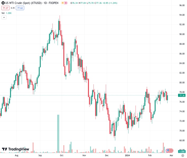 XTIUSD currently trading at 77.45 at the time of writing. Pair opened at 76.47 and is trading with a change of 1.28 % .