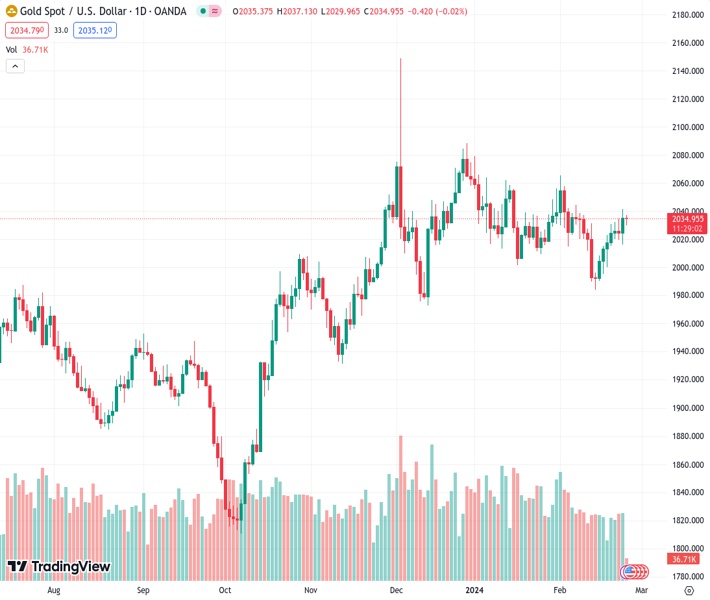 Gold price trades in a narrow range above $2,030 as investors await more guidance on interest rates. The near-term trend is slightly bullish as Gold is trading above the 20-day and 50-day Exponential Moving Averages (EMAs), which are around $2,020.