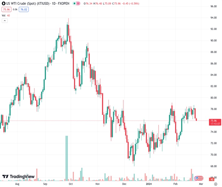 XTIUSD currently trading at 75.95 at the time of writing. Pair opened at 76.47 and is trading with a change of -0.68 % .