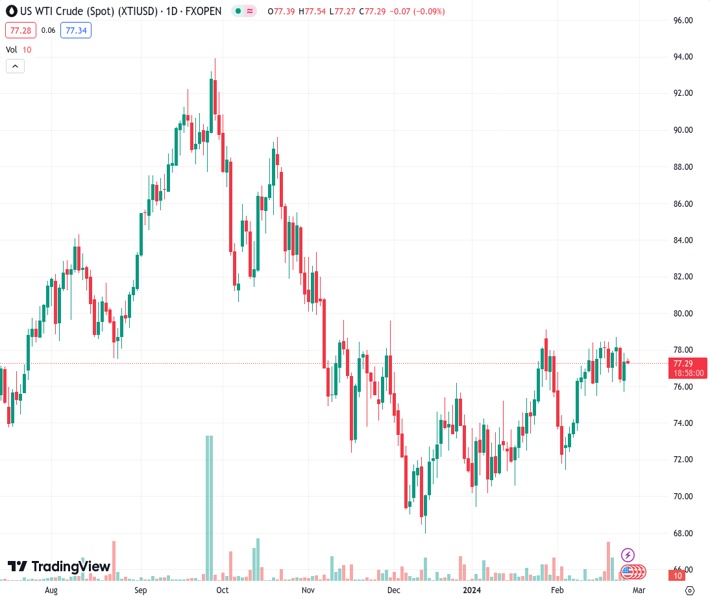 XTIUSD currently trading at 77.36 at the time of writing. Pair opened at 77.41 and is trading with a change of -0.06 % .