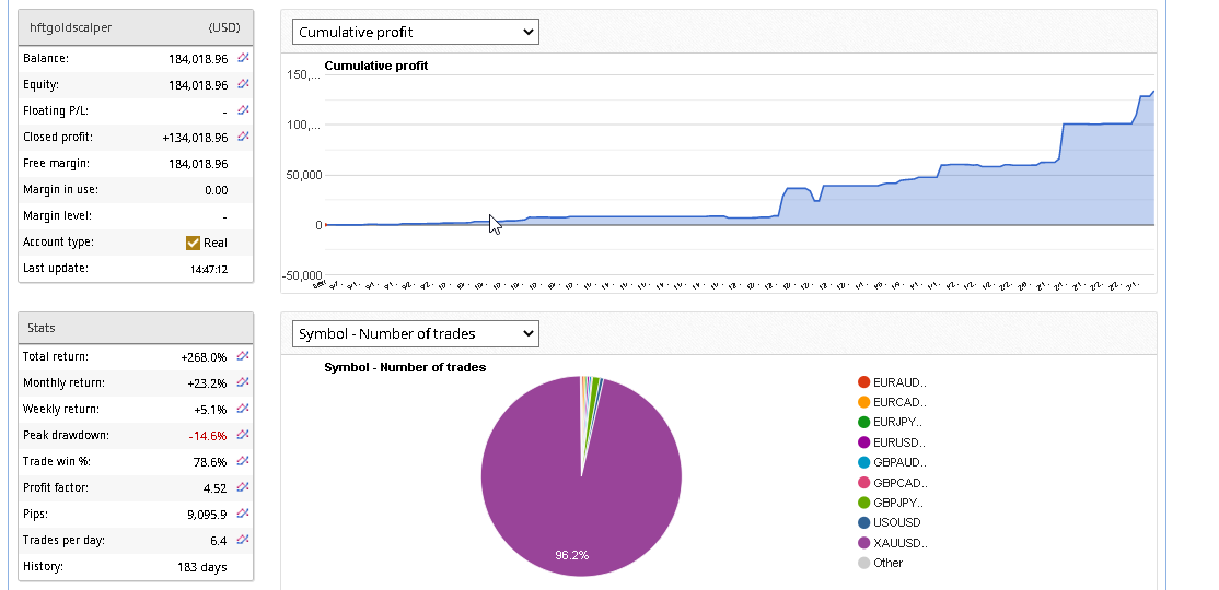 The GOLDSCALPER has now marched higher in March with a +15% gain. We continue it into March. The GOLD SALPER EA returns for February 2024 stands at +45%. The account has risen to $184,000. The system only trades GOLD on this account. The live account performance is shown below. It is rare to find such performance live on a account. Our systems are the most profitable long term systems you can find anywhere.