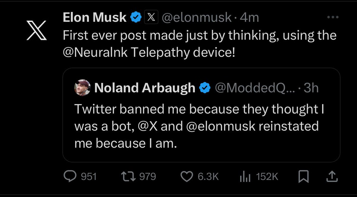 analysis **Elon Musk says world’s first Neuralink patient has made a post on X just by thinking.** By nehcap - March 23, 2024 0 332 FacebookTwitterPinterestWhatsApp **Elon Musk says world’s first Neuralink patient has made a post on X just by thinking.** Share this: Click to share on Facebook (Opens in new window) Facebook Click to share on X (Opens in new window) X Like this:Like Loading...