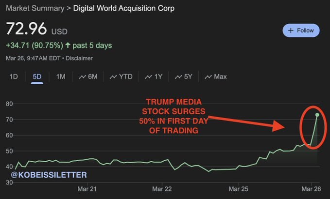 **BREAKING: Trump Media stock, ****$DJT****, soars over 55% in the first trading day and it has been halted limit up. ** The stock is up nearly 100% over the last 5 days and 375% in 2024.
