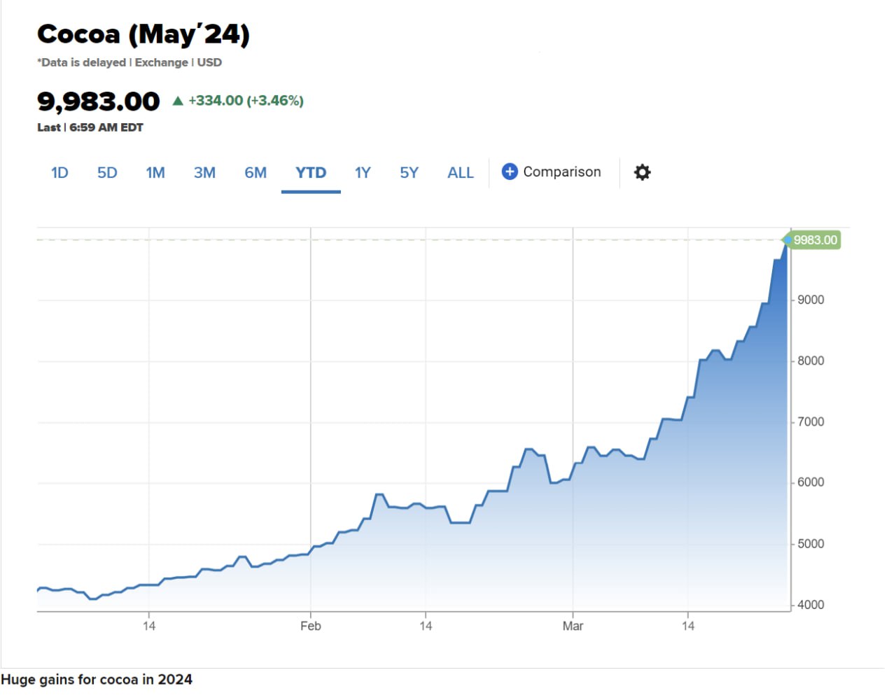 Cocoa reached a record higher on Tuesday as supply constraints forced prices higher. Futures for May delivery #CC1 were up 3.9% at $10,030 per metric ton, marking the first time the commodity broke above the $10,000 mark. The cocoa soaring these past year has led to wetter-than-normal temperatures and poor crop yields. An outbreak of the cacao swollen shoot virus has helped dent supply. The move comes as chocolate demand remains strong in countries such as the U