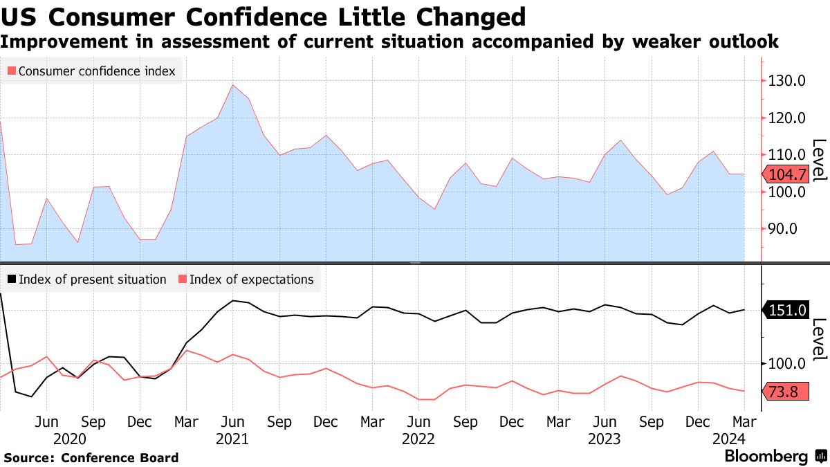 ** Consumer confidence in the United States remained at the same level in March. Americans were optimistic about their current situation but became somewhat more optimistic about the prospects**