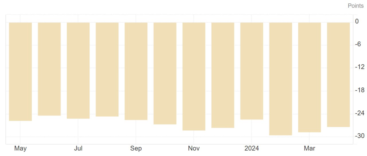 The global GfK consumer climate index for Germany accelerated from a marginally revised -28.8 in the previous period, to -27.4, reflecting modest increases in income expectations (-15.3 vs -4.8 in March) and in economic prospects (-12.4 vs 17.4) in nearly two years. As a result, a further decline in inflation was needed for a sustained recovery of the German economy.