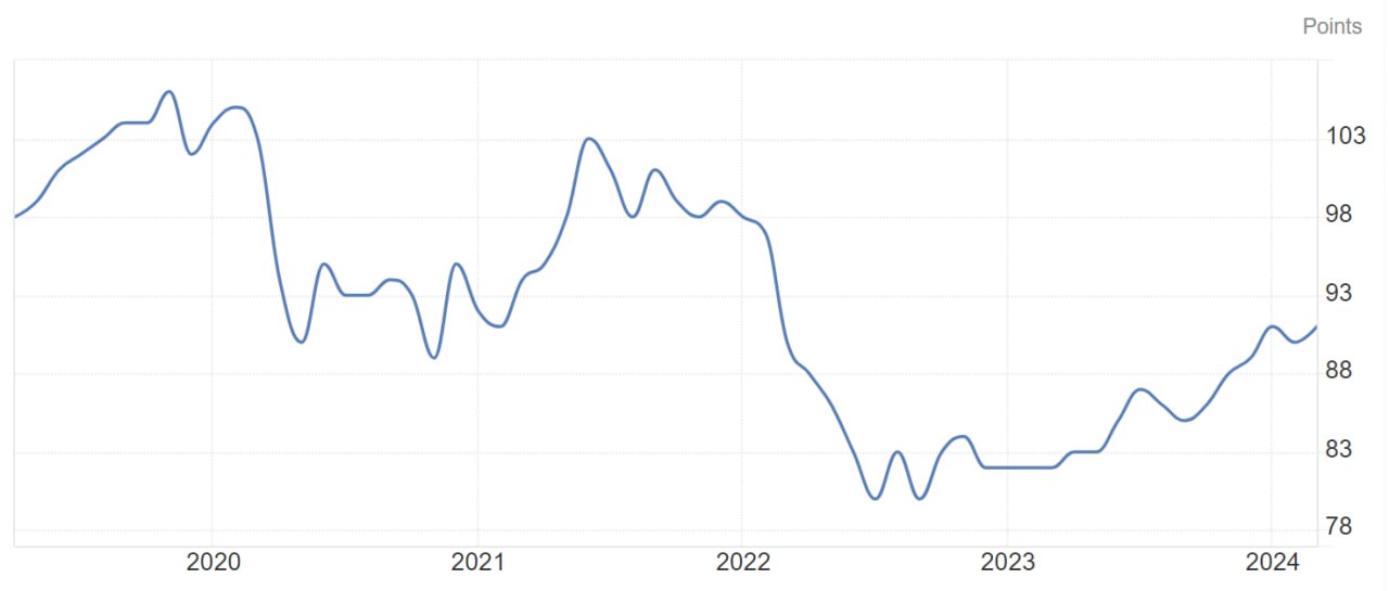 Consumer confidence in France rose to 91 in March 2024, reaching January’s near two-year high and compared to market estimates and February’s 90. Consumers were less pessimistic about the financial situation (-34 vs – 10) and the standard of living (-41 vs -42), the unemployment outlook decreased (22 vs 26) and future inflation is low (-50 vs -48).