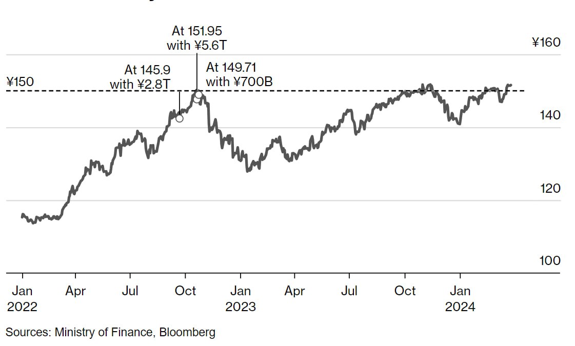 Japan stepped closer to intervention with its strongest warning yet as the yen slid to the weakest level in about 34 years against the dollar in Tokyo on Wednesday, passing the 151.95 level that led Japan to intervene in October 2022. Traders later backed away when Finance Minister Shunichi Suzuki ramped up his hints of possible action. The yen then strengthened later in the day after a report of a meeting between officials of the Finance Ministry, the central bank and the financial