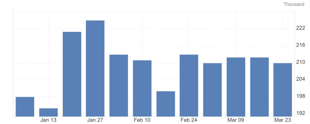 The number of people claiming unemployment benefits in the US eased by 2,000 to 210,000 over the week ending March 23rd, beating market expectations of 215,000 to extend the momentum of relatively low claim counts since the start of February. In the meantime, continuing claims rose by 24,000 to 1,819,000 in the earlier week, offsetting the downward revision from earlier in March to reach its highest since mid-January.