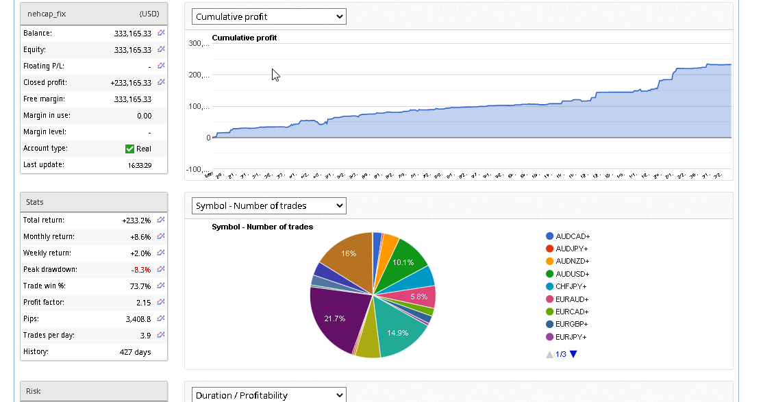 Client trades are adjusted as per account size. A min balance of $100 is all that is needed to run the system. However our average client trades well over 25k. Profits build over time and many have seen their account grow 2x since starting with us.