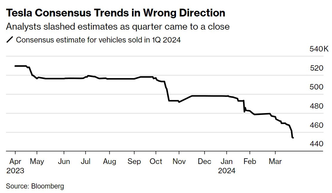 Tesla Inc. may be headed for a gloomy milestone as waning demand for electric vehicles and elevated interest rates take a toll on sales. Analysts on Wall Street have dramatically lowered their projections for this week’s deliveries report, which would be down over 6% from the company’s record record of the fourth quarter which tends to be the best time of year for sales. Key will be delivering more cars than the 422,875 managed in the first 3 months of 2023 and avoiding