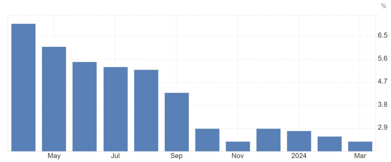 Consumer price inflation rates in the Eurospace decreased to 2.4% in March 2024 compared to its 28-month low of November and falling below market expectations of 2.6%, a preliminary estimate showed. Energy prices declined 1.8% (vs 3.7% in February) and non-energy industrial goods of 1.1% (vs 1.6%). On the other hand, the inflation for services remained constant at 4.0% on a monthly basis.