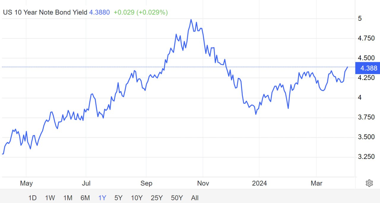 The 10-year note yield is now trading at its highest level since November 2023, 4.39% Stronger than expected inflation data and rising oil prices added to inflation worries over the last month. The 10-year note yield is now just 11 basis points from crossing 4.50%; small interest rate cut is now expected in 2024.