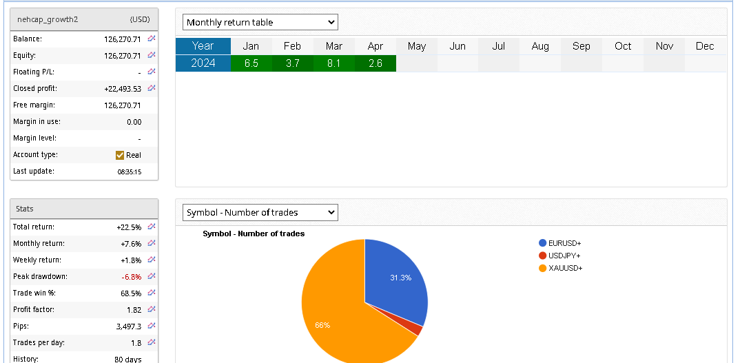 The EA_GROWTH April 2024 returns rises constantly to +2.6%. This is a system that operates on MT4. Exceptionally consistent and uses 1:2 r:r.