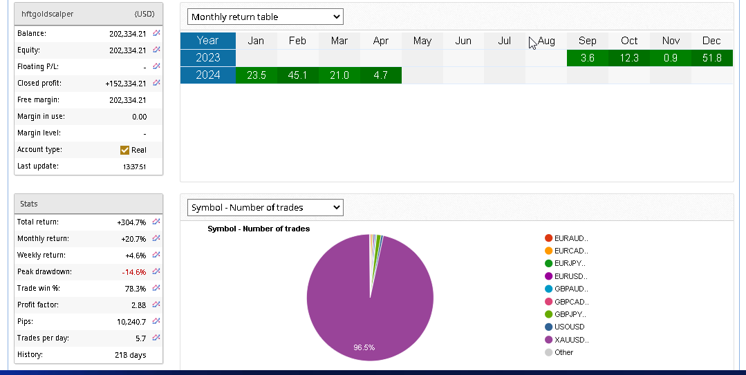 The MT4 EA GOLDSCALPER has already started to April returns Returns are rising with +4.7% added for April. Total returns = +304% The system only trades GOLD on this account. The live account performance is shown below. Client trades are adjusted as per account size. A min balance of $1000 is all that is needed to run the system. Profits build over time and many have seen their account grow 2x since starting with us.