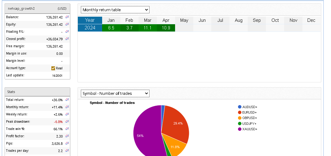 The EA_GROWTH April 2024 returns rises to +10.9%. This is a system that operates on MT4. Exceptionally consistent and uses 1:2 r:r.