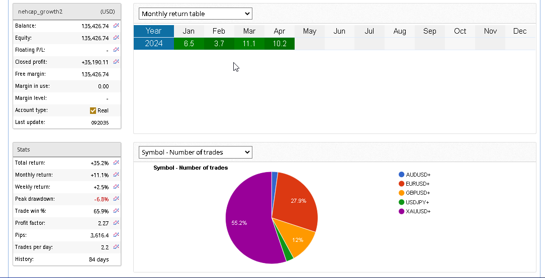 The EA_GROWTH April 2024 returns rises to +10.2%. This is a system that operates on MT4. Exceptionally consistent and uses 1:2 r:r.