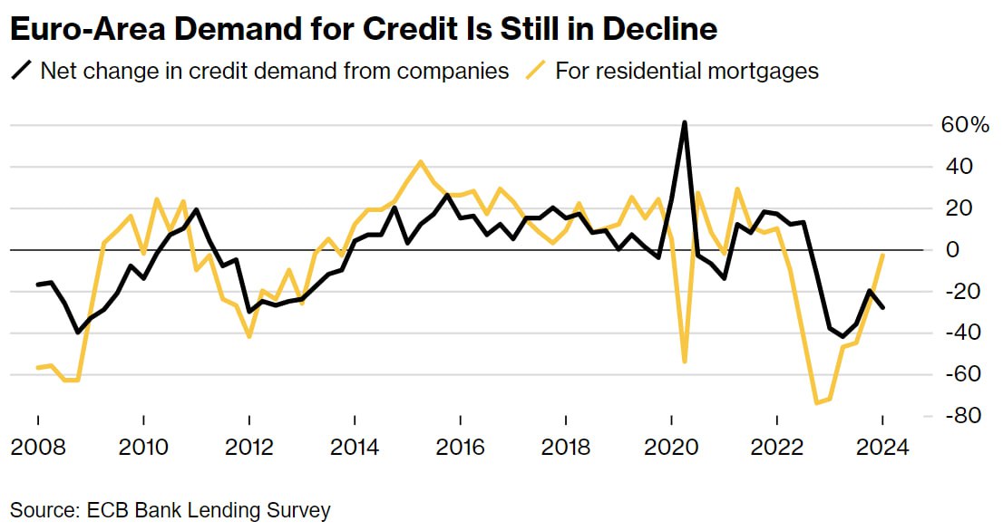 The demand for corporate loans in the euro area saw a “substantial drop” in the first quarter as the region continues to dread rising borrowing costs that probably won’t be cut until the middle of the year, the European Central Bank said. Credit standards — banks’internal guidelines for loans — were a little tighter for firms across the 20-nation bloc for the first time since late 2021. “Higher interest rates as well as lower fixed investment for firms and lower consumer confidence for households exert Source