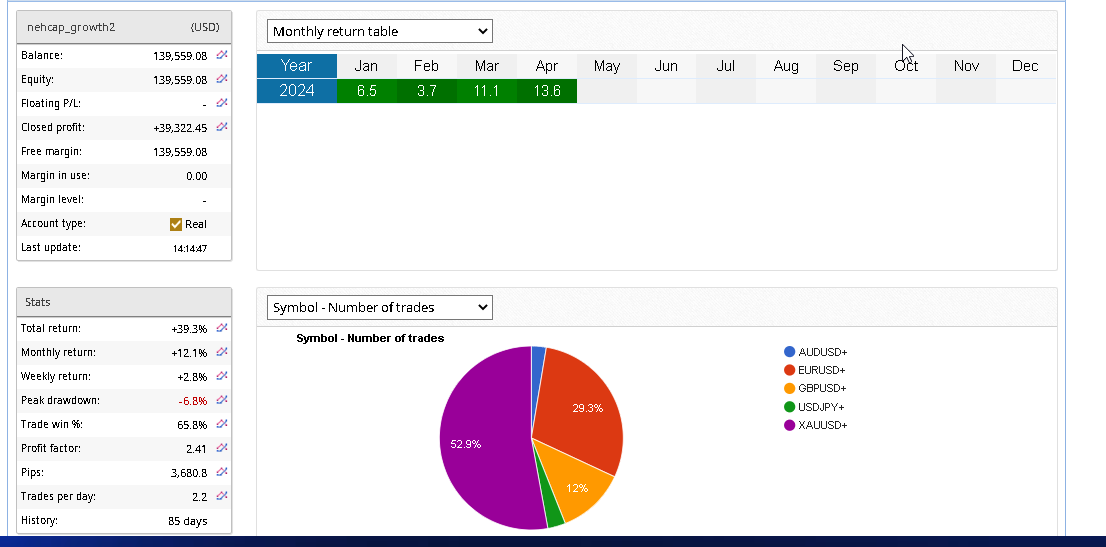 The EA_GROWTH April 2024 returns rises to +13% in the current month alone. This is a system that operates on MT4. Exceptionally consistent and uses 1:2 r:r.